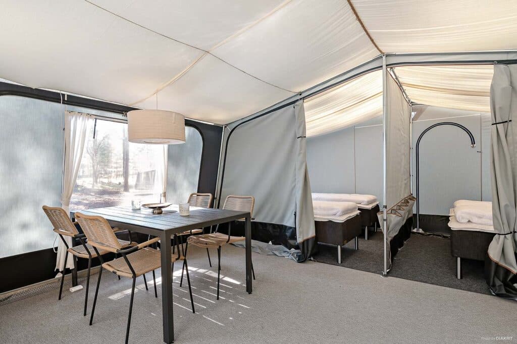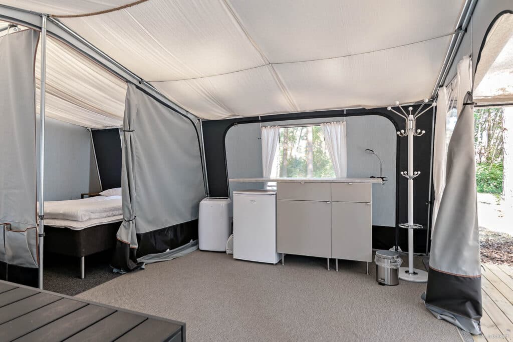 Velkommen til vores, til sæsonen 2021, helt nye glampingtelte! På 26 rummelige kvadratmeter er der alt hvad du behøver til en herlig teltferie. Vores glampingtelte har plads til op til fire personer i to soveværelser, hvor et værelse har en bekvem dobbeltseng og det andet to dejlige enkeltsenge.