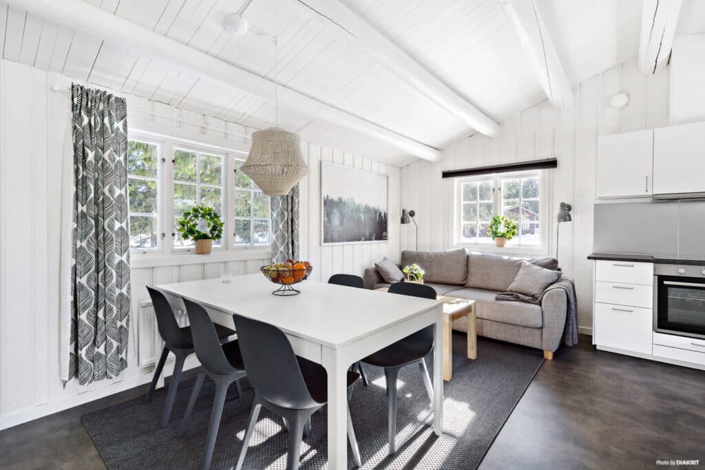 I denne hytte på 43 kvm er der plads til seks personer. Blacksta-hytten har to soveværelser, det ene med to enkeltsenge og to nedtrækssenge, det andet soveværelse har en enkeltseng og en nedtræksseng. Du kan nemt tilberede din middag i det fuldt udstyrede og moderne køkken med alt, hvad du behøver for at lave mad og spise i fred og ro. I stuen er der en sofa til hyggelige aftener og et stort spisebord med plads til alle husets gæster. Der er også eget badeværelset med brusebad og toilet.