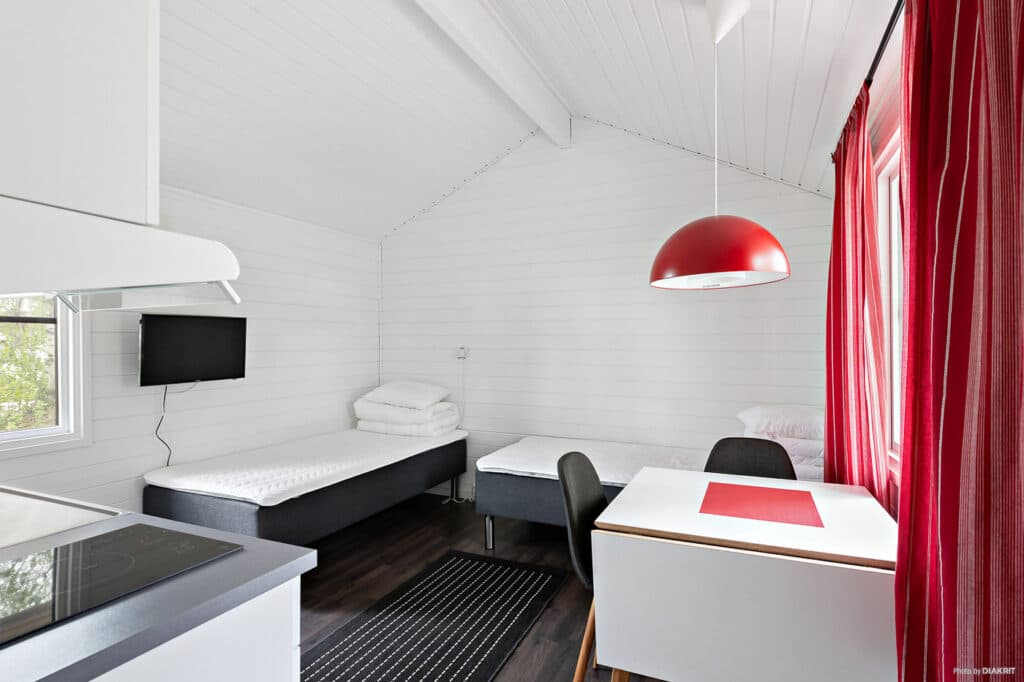 Her er et glimrende valg til det mindre rejseselskab. Vores Sandnäs hytter har et areal på 19 kvadratmeter, og der er plads til to senge. Fra hytten har du meget kort afstand til Luleälven og den lange fine sandstrand. Ideel til dig, der gerne vil have lidt ekstra guldkant i ferien. Sandnäs-hytterne er udstyret med eget toilet og bad samt køkken med ovn, kogeplader (bemærk undtagen hytte 8 som har et ældre køkken), mikroovn, køleskab, fryser, kaffemaskine og spiseplads, hvor du kan nyde gode middage. For ekstra bekvemmelighed er der også parkering ved siden af hytten.