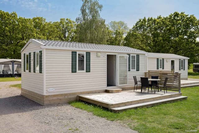 I denne villavogn bor du på 32 rummelige kvm med plads til 4 senge fordelt på to værelser. Det ene værelse har en dobbeltseng og det andet har to enkeltsenge. Et perfekt valg for familien eller vennegruppen, der har brug for lidt mere plads. Der er også bad og toilet i villavognen for ekstra komfort. Her kan I også tilberede jeres egne måltider, da der er både køkken/tekøkken, mikroovn, køleskab, fryser, kaffemaskine og spiseplads. Ja, alt hvad du behøver for en komplet ferie. I opholdsstuen er der også TV. Udenfor døren finder du en hyggelig terrasse, hvor du kan nyde de skønne omgivelser.