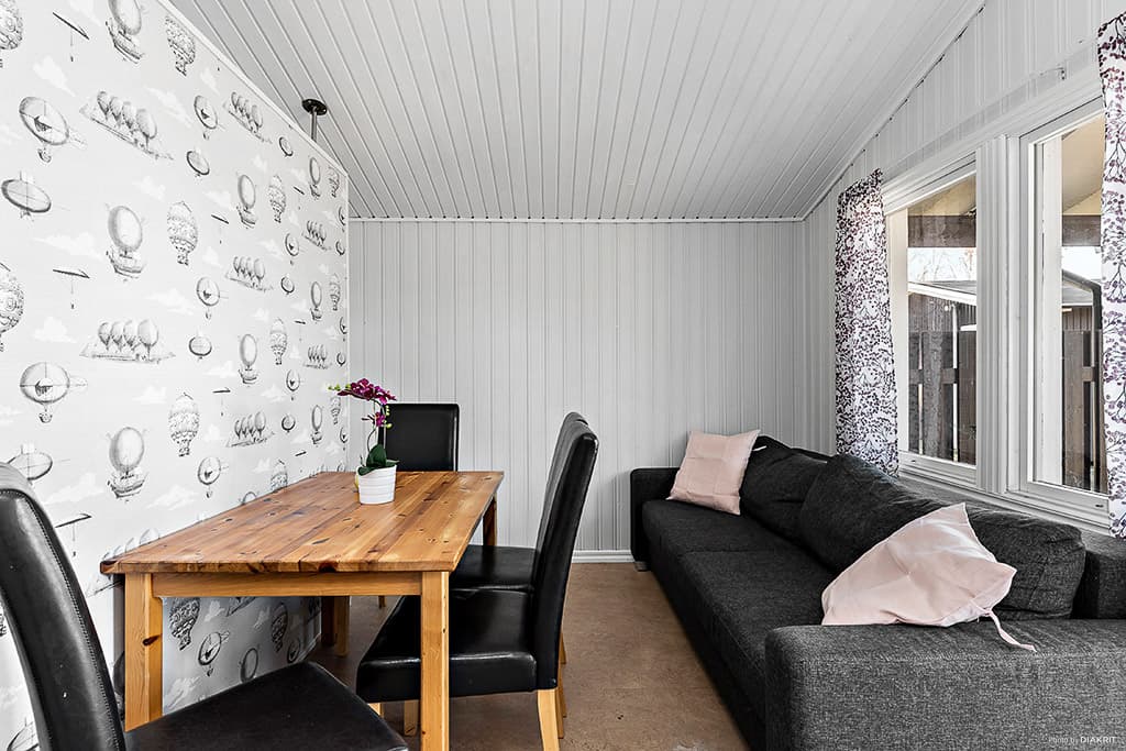 Sengepladserne er fordelt på en dobbeltseng og en køjeseng samt en sovesofa til to personer.