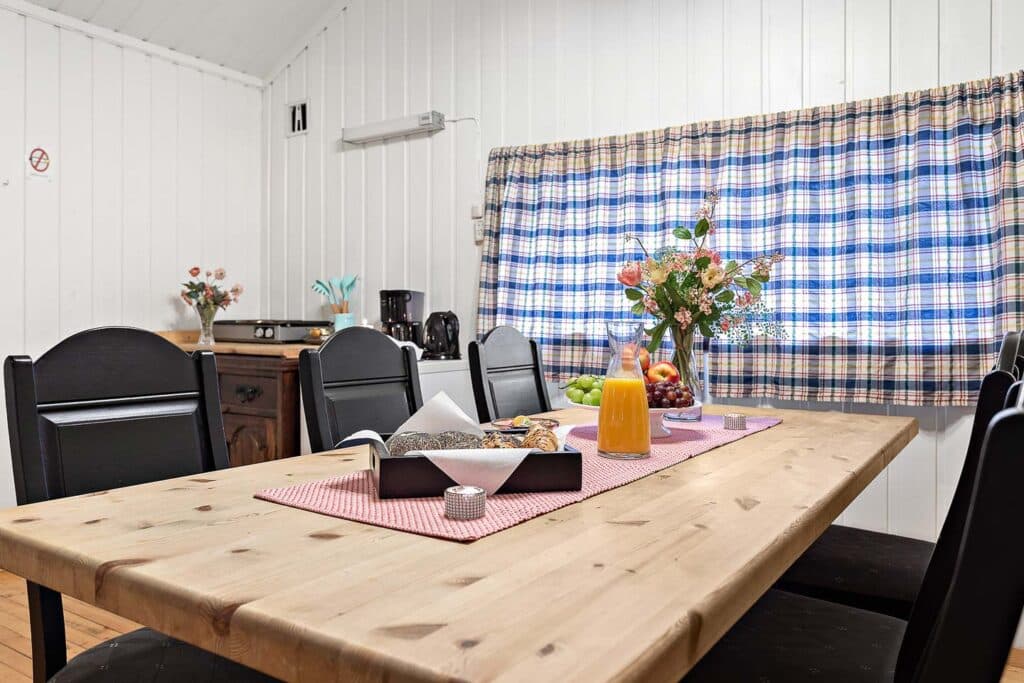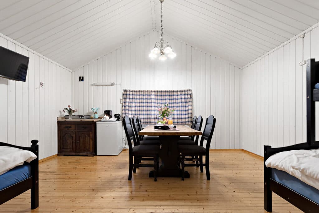 Velkommen til Stabburet! Her bor op til seks personer på hyggelige 24 kvadratmeter. Sengene er opdelt i to familiekøjesenge i fællesarealet, så dette er en perfekt bolig for dig, der rigtig gerne vil socialisere. Køleskabe og kogeplader er tilgængelige for lettere madlavning.