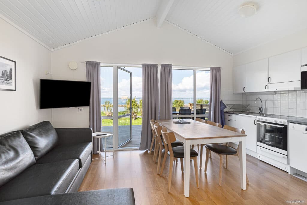 Vätternstuga er vores 6-sengshytter på 34 kvm, som ligger aller tættest på vandet. Hytterne har badeværelse med brusebad og toilet. Hver hytte har et opholdsrum med tv, en møbleret terrasse og uderum med udsigt over søen. Hytterne har to soveværelser, hvoraf det ene har to køjesenge og det andet har en dobbeltseng. Der er dyner og puder til alle hyttens senge. Køkkenet er udstyret med porcelæn og andet køkkenudstyr såsom opvaskemaskine, mikrobølgeovn, kaffemaskine, køleskab og fryser. Der er parkeringsplads ved hytten.