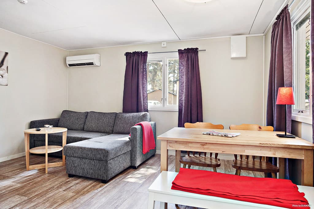 Her venter en hyggelig ferie i den charmerende Blå Jungfruhytte på 30 kvm beliggende i kort gåafstand til havet. En lys og rummelig hytte med plads til den lidt større familie. Hytten har en møbleret, overdækket terrasse, hvor du kan nyde dejlig morgenmad på sommerens skønne morgener. Inde i hytten er der et kombineret alrum og køkken med spiseplads, TV samt sovesofa til to personer. Køkkenet er udstyret med køleskab, fryser, komfur, ovn samt en mikroovn. Soveværelset er indrettet med to køjesenge, og der er dyner og puder til alle hyttens senge. I badeværelset er der både brusebad og toilet.