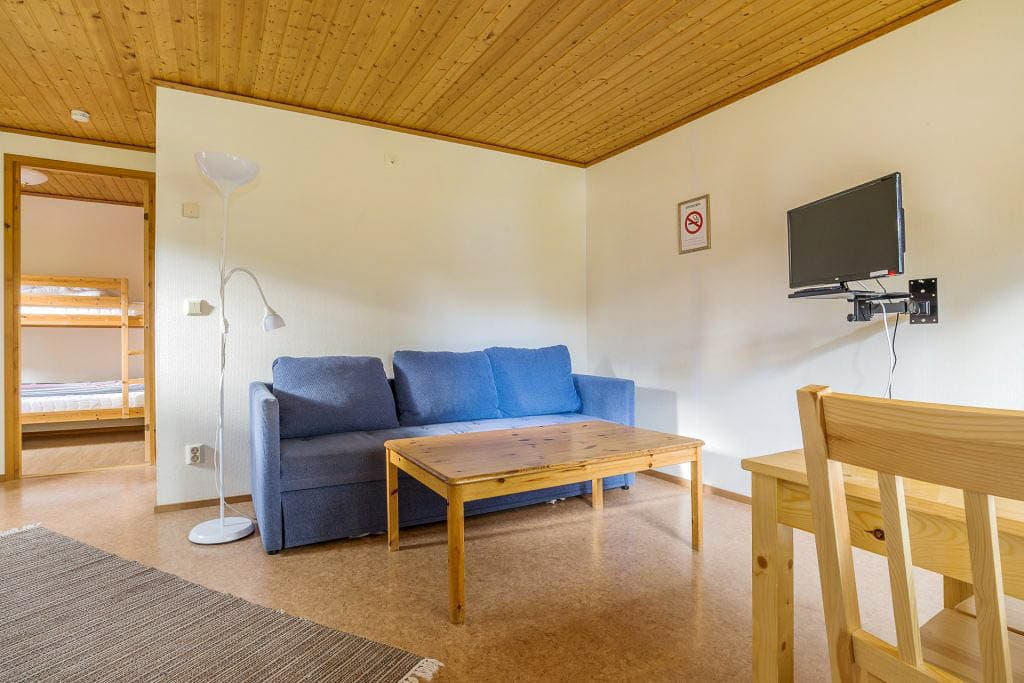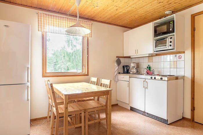 Fin hytte på hele 40 kvm med to soveværelser og plads til fire personer. I det ene soveværelse er der en smallere dobbeltseng, og i det andet soveværelse kan du sove komfortabelt i en køjeseng. Alrummet er udstyret med tv og tekøkken med kogeplader, køleskab og mikrobølgeovn. Der findes almindeligt køkkenudstyr og service. Hytten har eget badeværelse med brusebad og toilet. Uden for hytten er der en dejlig terrasse med havemøbler, hvor du kan nyde de dejlige omgivelser.