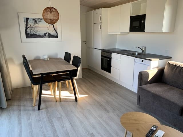 Fjordhytten er indrettet til at rumme op til 5 personer, med sovepladser fordelt på to soverum og en sovesofa i stuen. Hytten indeholder også bad og toilet, samt et kombineret stue/køkkenområde med de mest nødvendige faciliteter, herunder et komfur, køleskab, elkoger, kaffemaskine, og tv. Derudover har hytten en overdækket terrasse, hvor du kan nyde udsigten og de rolige stunder. Nogle af hytterne kan prale af en direkte fjordudsigt fra terrassen, men uanset hvor du er placeret i området, kan du nyde den smukke udsigt over fjorden. Vi ser frem til at byde dig velkommen!