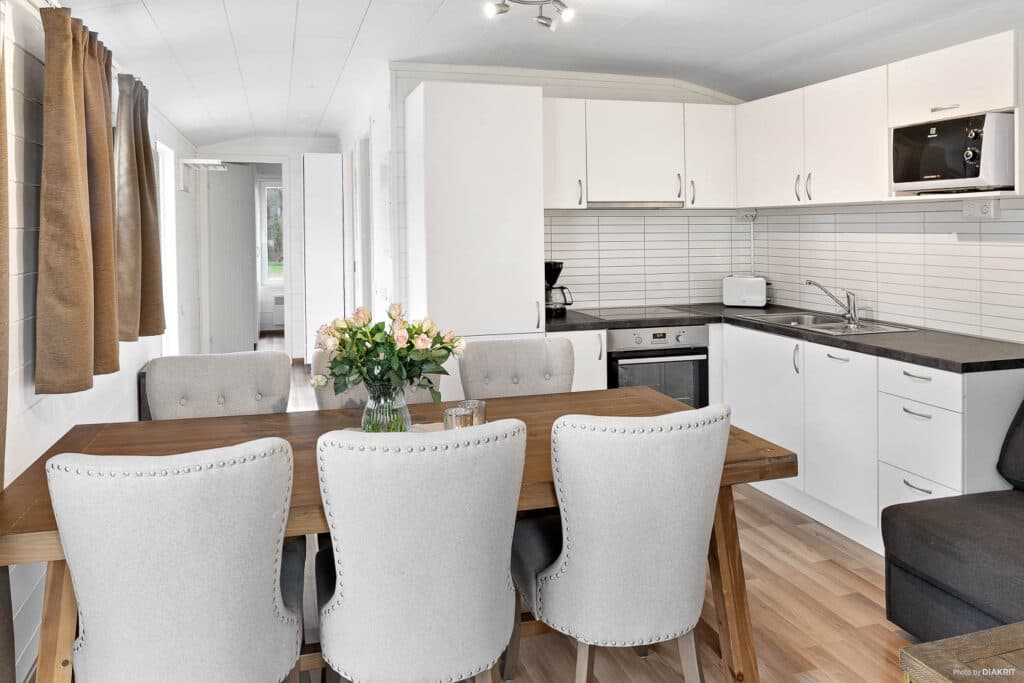 Velkommen til en moderne og rummelig hytte. Her bor du på 40 kvm, perfekt for den større familie eller for dig, der foretrækker ekstra plads. Hytten har hele fire senge og en sovesofa til to personer i stuen. Sengene er fordelt på to soveværelser, ét med køjeseng og et med to enkeltsenge. Her er et fuldt udstyret køkken med alt, hvad du kan have brug for til at lave en lækker middag. I hytten er der også et TV til afslappende aftener indendørs samt et stort spisebord, hvor hele familien kan samles til middag og nyde lækre måltider eller livlige spilaftener. Eget badeværelse med bruser og toilet findes i alle hytter. Hytterne er placeret tæt på legepladsen, hvilket er perfekt, hvis du har børn.