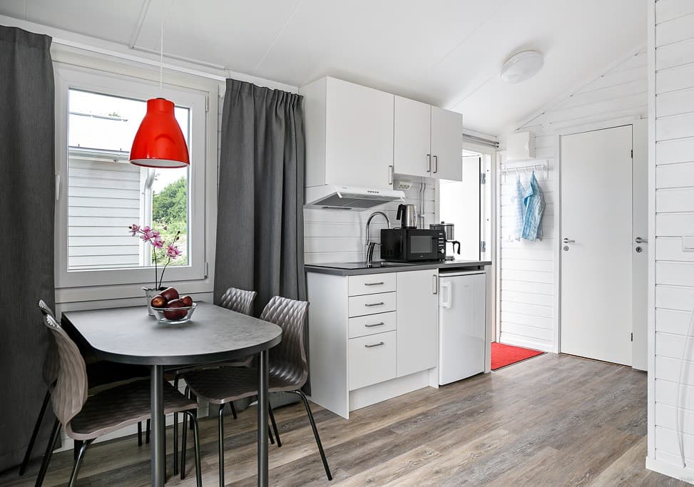 I hytten er der et kombineret alrum og køkken, soveværelse samt badeværelse. Køkkenet indeholder komfur, køleskab og mikroovn. Alrumdelen består af en sovesofa til to personer og spiseplads. I soveværelset er der en enkeltseng med en seng ovenfor som kan slås ned, perfekt når hele familien er til stede. Der er dyner og puder til alle hyttens senge. I badeværelset er der brusebad og toilet. Her er også en møbleret terrasse til skøn morgenmad og grillaftener. Parkering er tilgængelig ved siden af hytten.