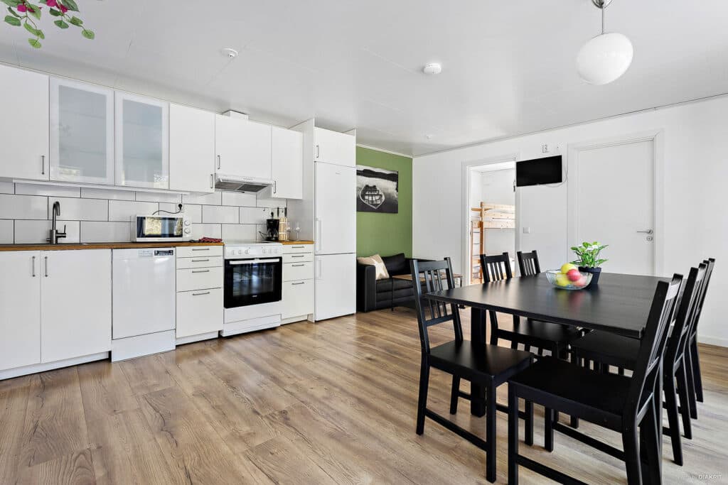 Nybygget og moderne hytte fordelt på tre separate soverum, et soverum med to enkeltsenge og to soverum med hver sin køjeseng. Der forefindes dyner og puder i hytten. Fuldt udstyret køkken med opvaskemaskine, køleskab og fryser, komfur med ovn, mikroovn og kaffemaskine. Flisebeklædt badeværelse med toilet, bruser, vaskemaskine og tørretumbler. Til hytten hører en dejlig veranda på hele 25 kvm med havemøbler for skønne aftener.
