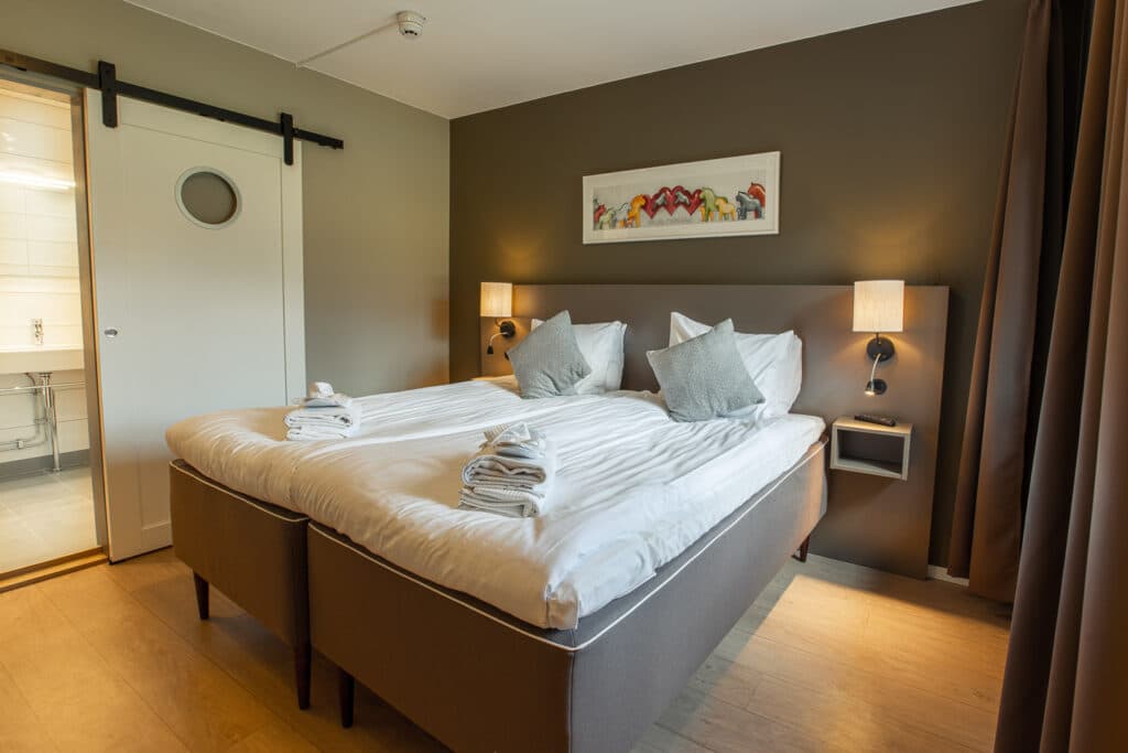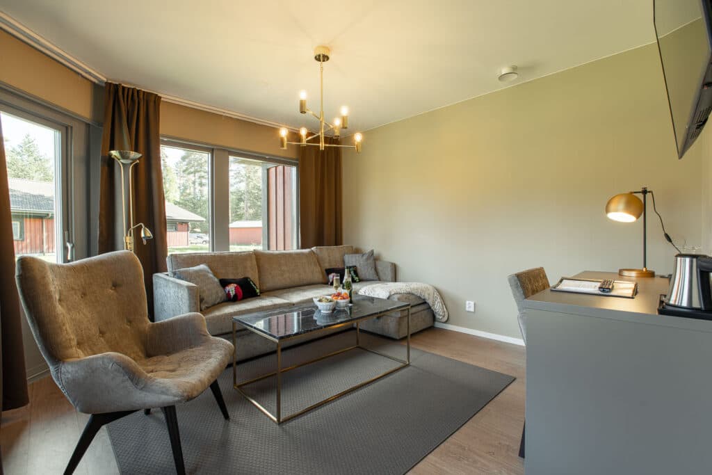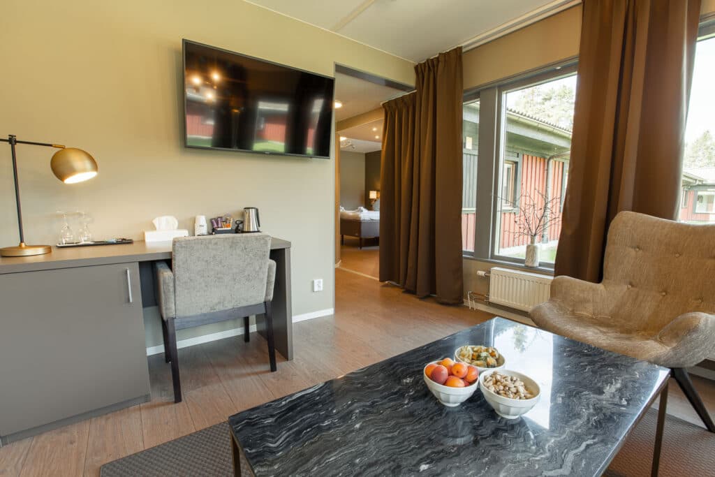Velkommen i vores suite på 35 kvm. Soveværelse med kontinentalseng på 180 cm og TV. Opholdsrum med divansofa med sengemål 140 cm, skrivebord, TV og minikøleskab. Badeværelse med toilet, badekar og loftsbruser. TV-kanaler: SVT1, SVT2, TV3, TV 4, Kanal5, TV6, Viasat Sport og Børnekanalen. Adgang til motionsområde, sauna og relaxrum. Morgenmad, sengetøj og rengøring er indberegnet.