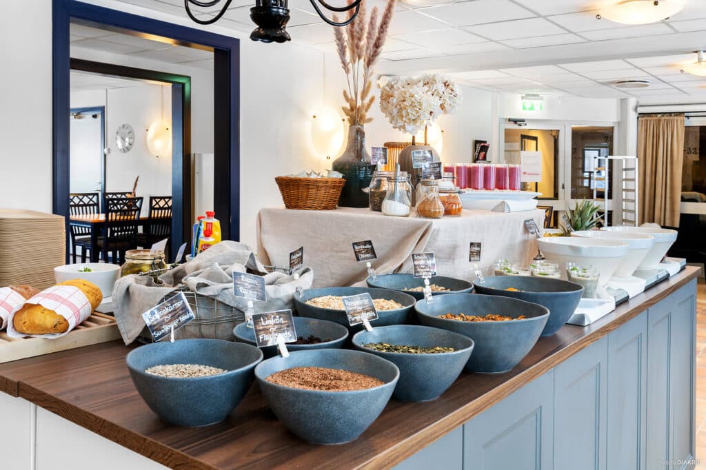 Morgenmadsbuffet serveres dagligt på hotellet. For 125 kr får du den bedst mulige start på dagen!