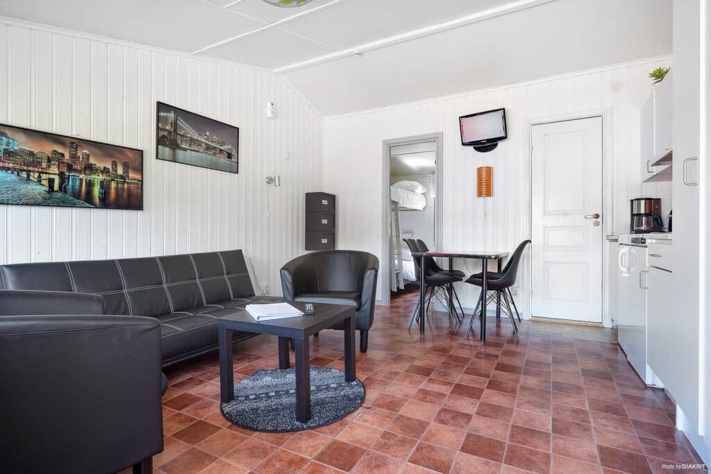 Hyggelig hytte på 26 kvm. Hytten har et soveværelse med to køjesenge, samt en sovesofa i alrummet. I hyttens tekøkken finder du udstyr til simpel madlavning i form af komfur, køleskab, fryser, mikrobølgeovn og kaffemaskine. Nyd måltiderne ved spisebordet med fire stole. Der er et tv i alrummet til dem, der ønsker at hygge sig foran det. Der er også eget badeværelse med brusebad og toilet. Hyttens møblerede veranda er perfekt til morgenmad eller hyggelige middage med dem, du holder af.