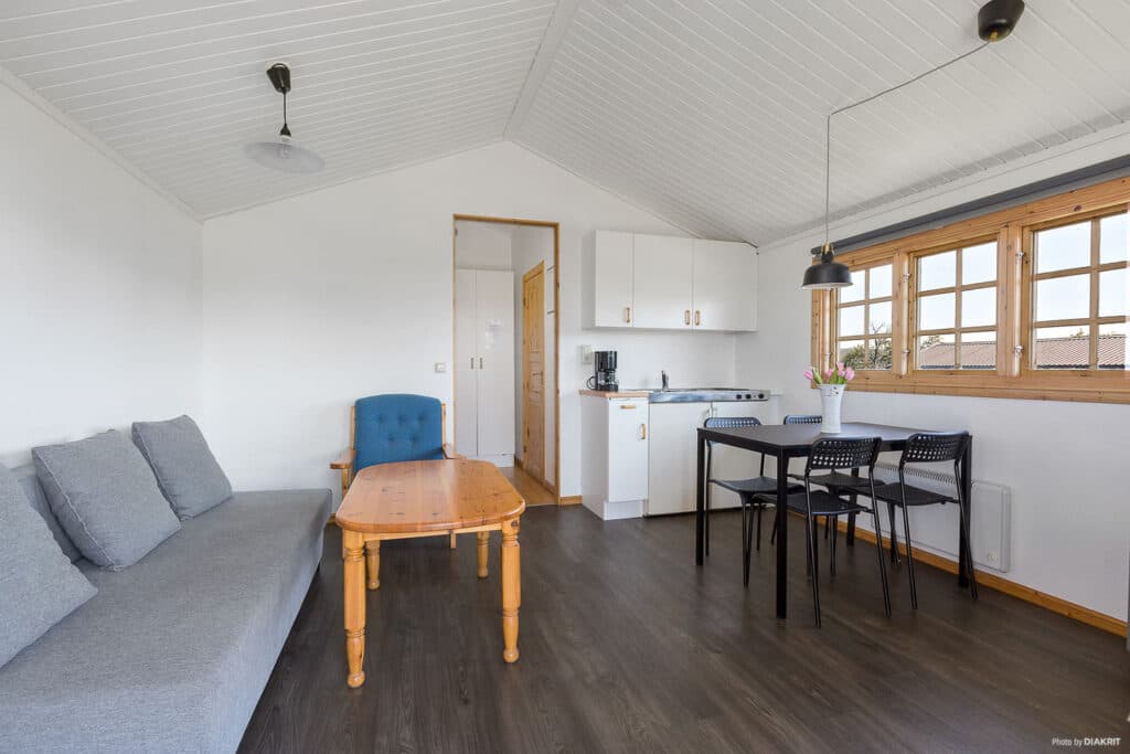 Det er en af vores større hytter på destinationen. Nora-hytten Plus er en hyggelig hytte, som med sine 26 kvm rummer fire sengepladser fordelt på to værelser. Sengepladserne er fordelt på en køjeseng og en sovesofa med plads to personer. Nora-hytten Plus har badeværelse med brusebad og toilet. Der er også et køkken med komfur, køleskab, fryser og kaffemaskine. Uden for døren er der en dejlig terrasse, hvor du kan nyde morgenkaffen og gode måltider med dine kære. Nyd fantastisk indkvartering i smukke og fredelige omgivelser.