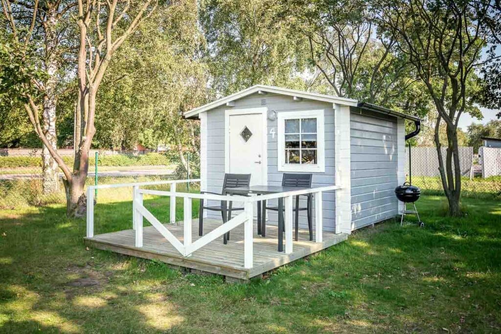 Enkel campinghytte på 7 m² med 2-3 senge i køjeseng (120+80 cm). TV, køleskab og kaffemaskine findes, ikke tekøkken eller rindende vand. Brusebad og toilet samt køkken findes i servicehuset. Hyggeligt og prisbilligt indkvarteringsalternativ.