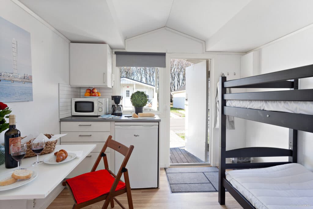 Der er naturligvis en tiltalende charme ved at bo så afslappet spartansk. Hvis du hellere tager en opfriskende dukkert i havet i stedet for det almindelige, lidt kedelige, morgenbrusebad, så er denne indkvartering noget for dig! Badehytten er en hytte på 10 kvm til to personer. Brusebad, toilet og fælles køkken findes i den nærliggende servicebygning. I hytten er der to senge i en køjeseng og køleskab og mikroovn. Der er dyner og puder til hyttens senge. Her er også en lille, hyggelig terrasse, hvor du kan nyde en kop kaffe om morgenen.