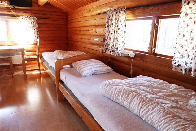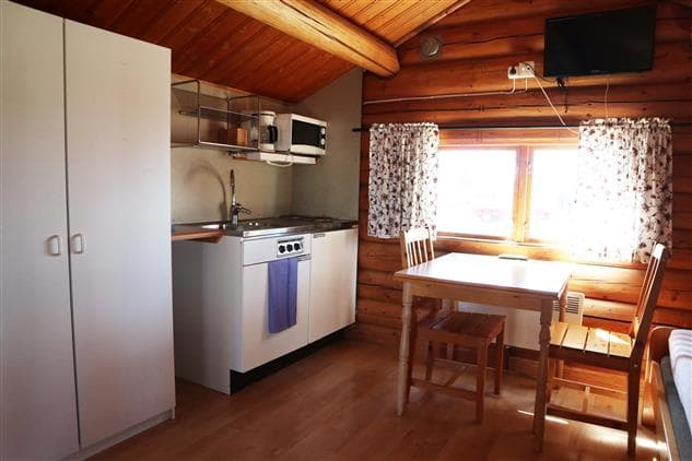 Tinastuga er 15 kvm og har plads til to personer. I hytten står to enkeltsenge med dyne og pude. Køkkenet er udstyret med mikroovn, køleskab, komfur og kaffemaskine samt husgeråd. Hytten har tv. Badeværelset har brusebad og toilet.