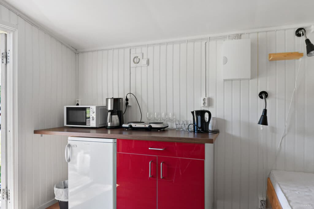 Hytten er indrettet med spisebord og stole. Køkkenet har køleskab, mikrobølgeovn, to kogeplader, to gryder samt det vigtigste køkkenudstyr og service til seks personer. Der er ikke rindende vand i hytten, men der findes vanddunk og opvaskebalje. Hvis I ønsker en stegepande, er I hjertelig velkomne til at låne en i receptionen. Det er tilladt at tage sin firbenede ven med i denne hytte – tilføj det direkte i onlinebookingen.
