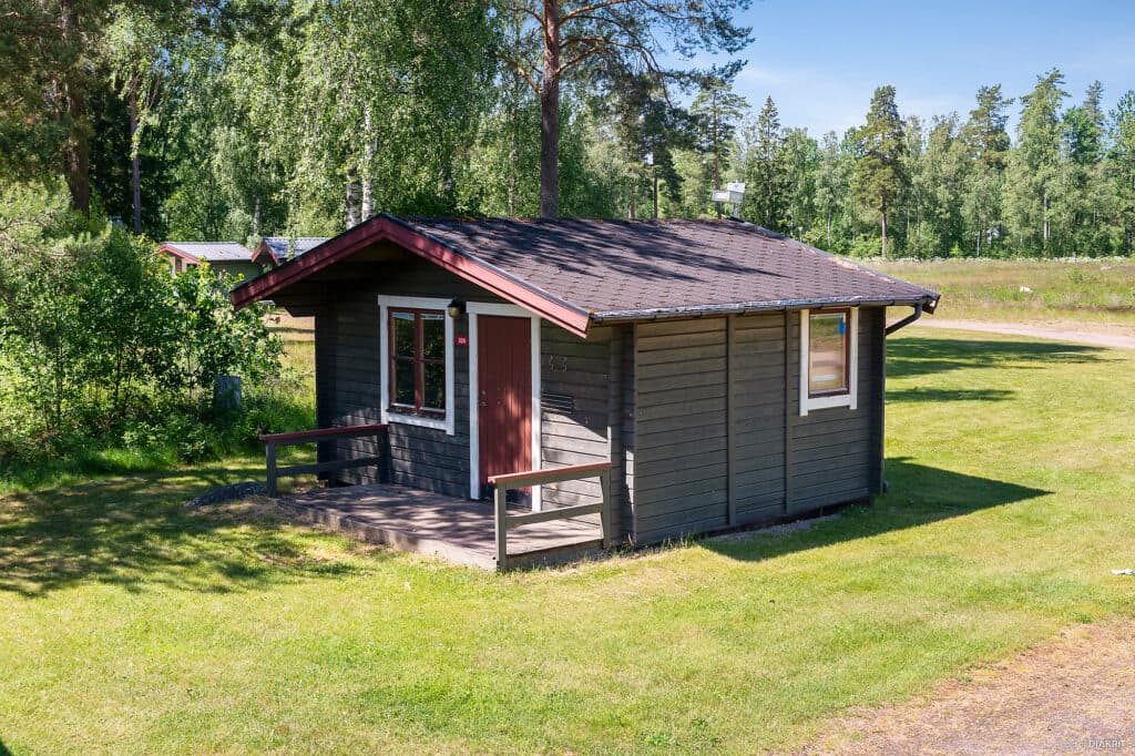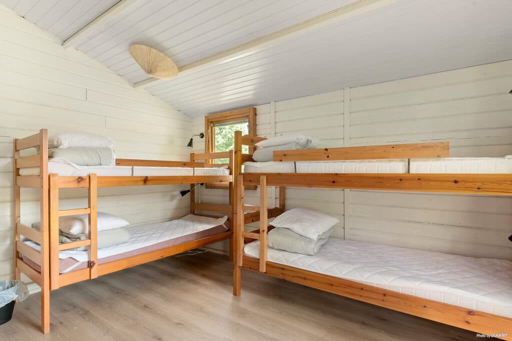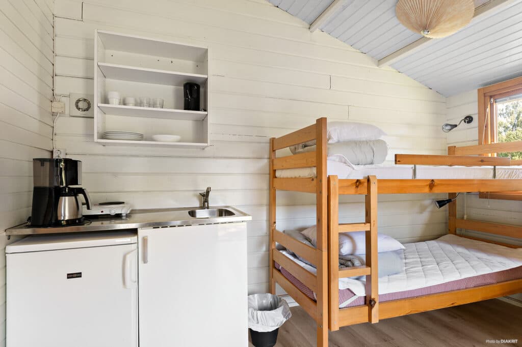 En lidt større og hyggelig hytte på 16 m² med fire sovepladser fordelt på to køjesenge. Den øverste seng er 80 cm bred, og den nederste er 120 cm. Hver seng har madras, dyne og pude.