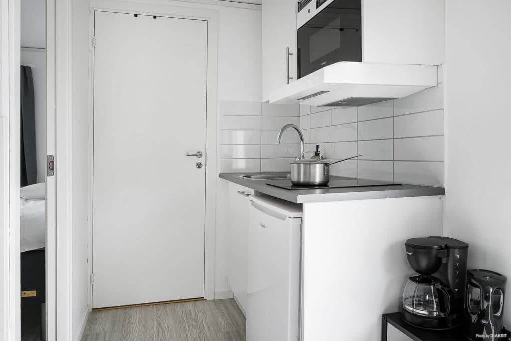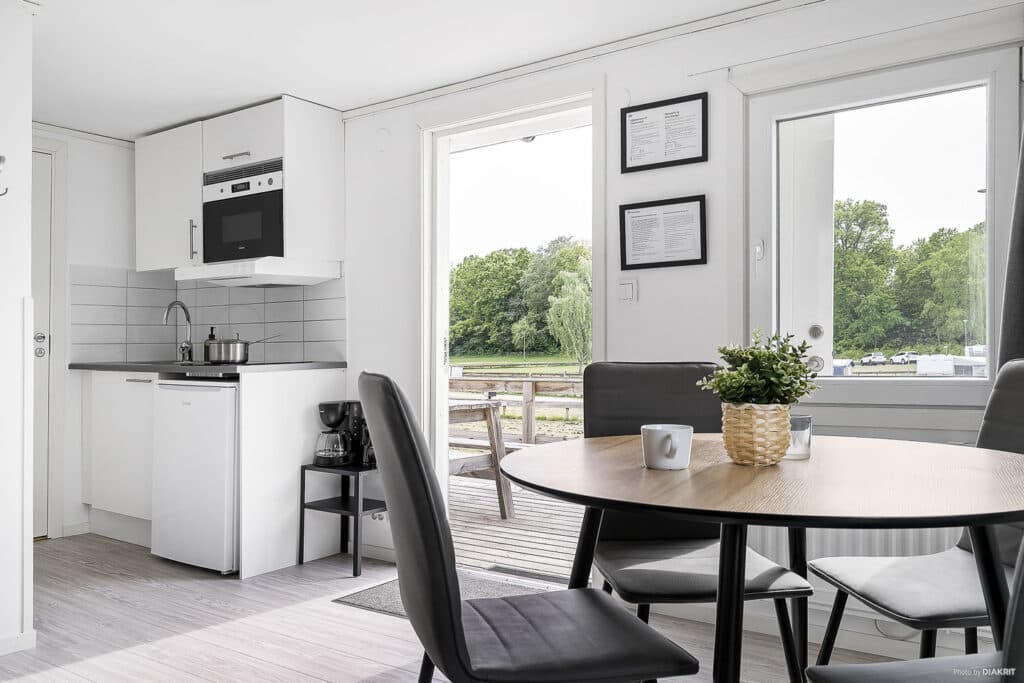 Friske hytter med høj standard for op til tre personer. Aspöhytterne er udstyret med brusebad, toilet, køkken, soveværelse, alrum med tv, sovesofa samt køkkenbord. Køkkenet er udstyret med tekøkken, køleskab, to kogeplader samt porcelæn og køkkenudstyr.