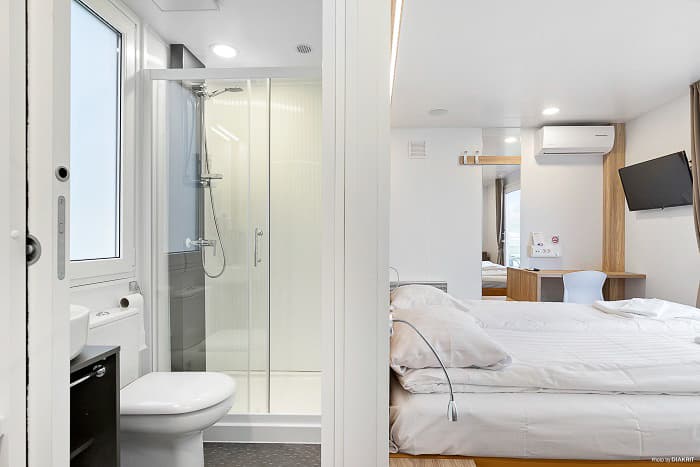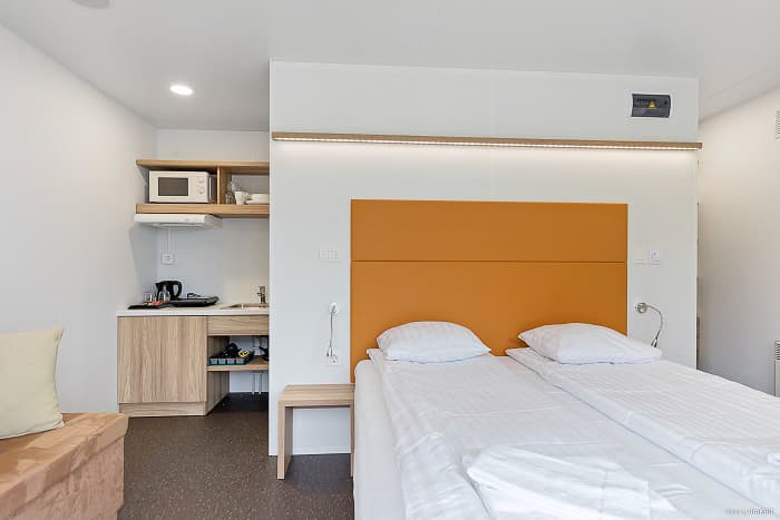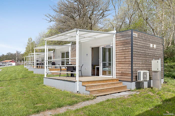 Naturnær hytte på 16 kvadratmeter med et moderne interiør og tekøkken. Udstyret med dobbeltseng, sovesofa, moderne brusebad og toilet og opbevaringsplads samt køkkentilbehør. I alt to senge til voksne samt plads til et barn i sovesofaen. Moderne smuk LED belysning. Skøn terrasse med udemøbler uden for værelserne med udsigt over vandet.