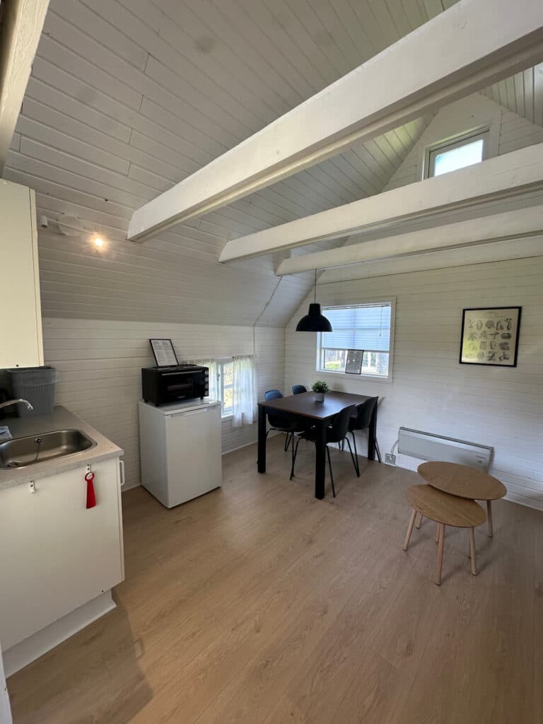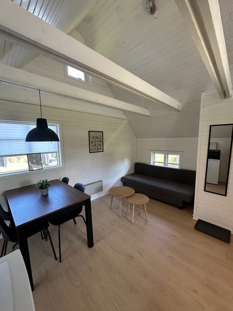 Denne veludstyrede hytte består af et værelse og et opholdsrum. Indrettet til 4 personer. I opholdsrummet er der spisebord med stole, te køkken og sovesofa med plads til to personer.