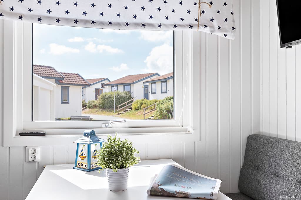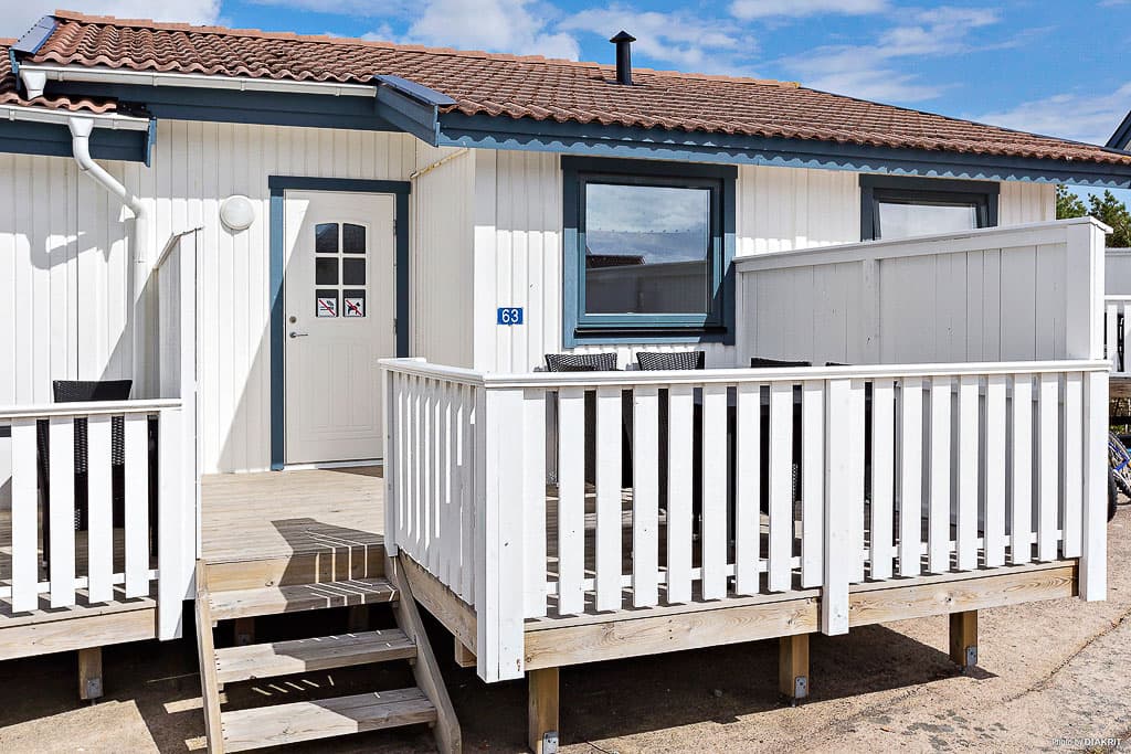 Behagelig og smagfuld indkvartering i parhytte. Hytten er 33 kvm og har plads til 6 personer. Efter en dag med sol og badning kan du nyde den varme sommeraften i havemøblerne på terrassen. Hytten har to værelser og en hems med to sengepladser. Soveværelset har dobbeltseng, to lænestole og et moderne vægmonteret tv. Der er også en sovesofa med sengeplads til to personer. Der er dyner og puder til alle hyttens senge. Det fuldt udstyret køkken har køleskab, fryser, ovn, komfur og opvaskemaskine. Badeværelset har brusebad og toilet.