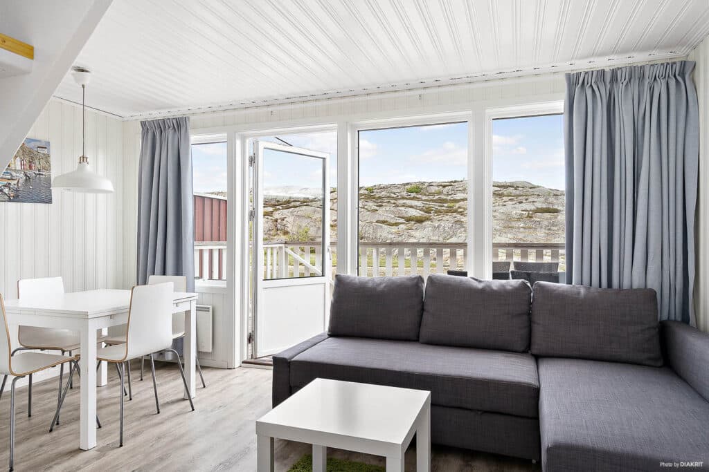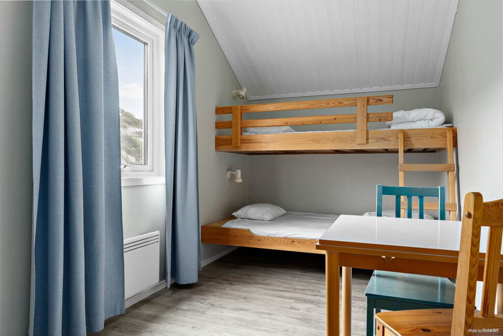 Sengepladserne er fordelt på en dobbeltseng og en køjeseng samt en sovesofa til to personer.