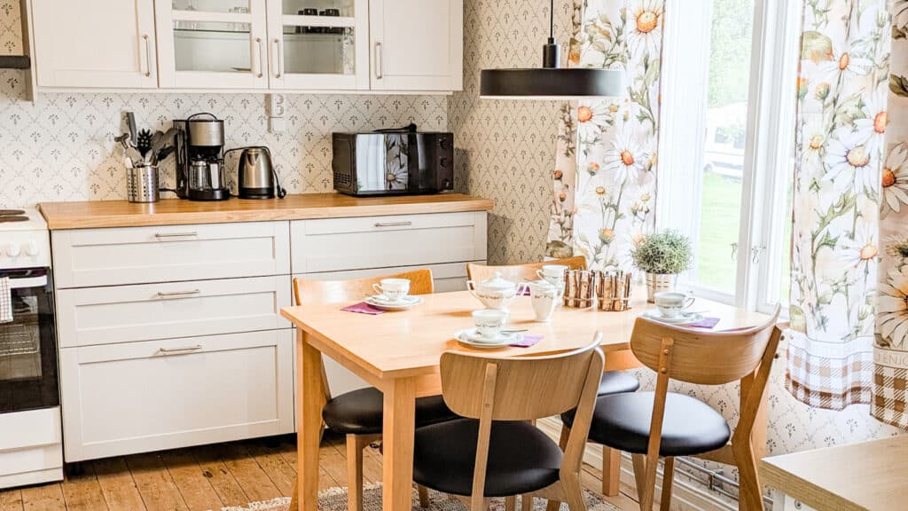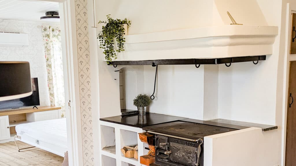I den store stue er der sofagruppe og en vægmonteret dobbeltseng, som nemt foldes ned ved sengetid. Der findes også et separat soveværelse med enkeltseng samt et mindre rum med en lille enkeltseng (70×180 cm). Puder og dyner findes til alle senge; medbring sengetøj og håndklæder eller tilkøb det direkte i online-bookingen. I entréen er der et lille toilet, og køkkenet er udstyret med komfur med ovn, køl og frys, mikroovn og kaffemaskine – alt, hvad du behøver til gode måltider, der om sommeren nydes i haven.