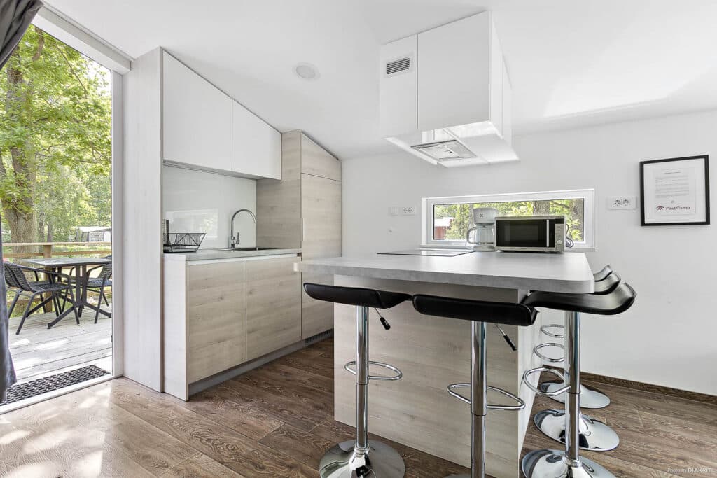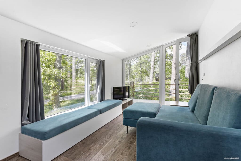 Vores Stensöhytter er fordelt over 45 dejlige kvadratmeter med delvis udsigt over vandet. I hytten er der plads til op til seks personer, som kan nyde ferien. Sengene er fordelt i to soveværelser, hvoraf et værelse med to enkeltsenge og et værelse med køjeseng. I alrummet er der også en sovesofa, hvor en til to personer kan få sig en god nats søvn. I hytten er der også gulvvarme, AC, et fuldt udstyret køkken med alt hvad du behøver til at lave en god middag og store panoramavinduer. Velkommen til at nyde ferien i Stensöhytten!