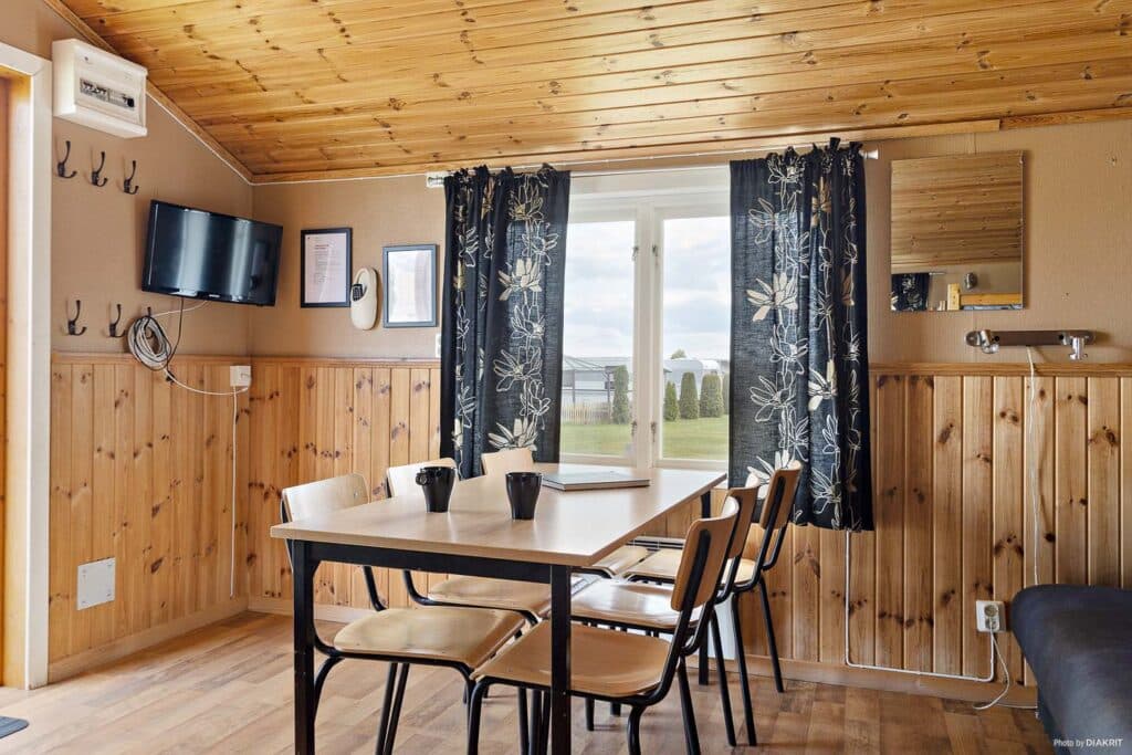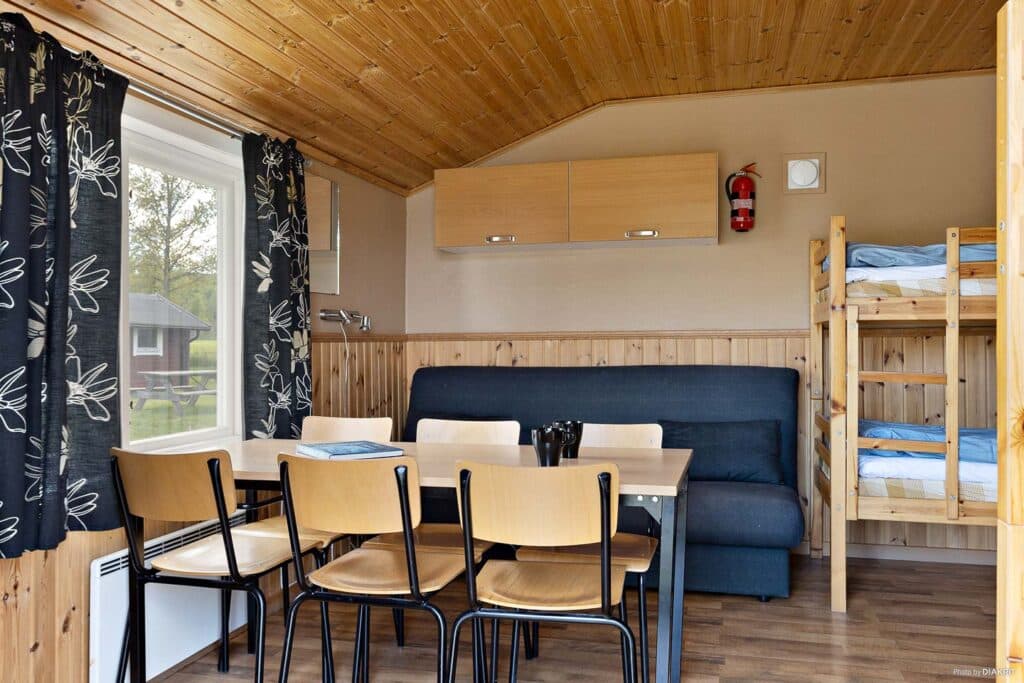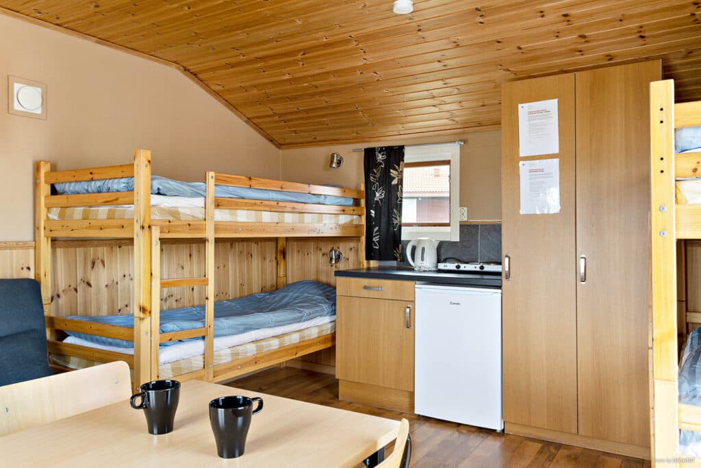 Frykenstuga Extra har et værelse på 16-17 kvm og er møbleret med to køjesenge, en sovesofa samt stole og et bord. Der er en kogeniche med køleskab, kogeplade, elkedel og enklere køkkenudstyr samt en dunk til at hente vand i. Der er dyner og puder til alle hyttens senge. Brusebad, toilet og køkken findes i det nærliggende servicehus.