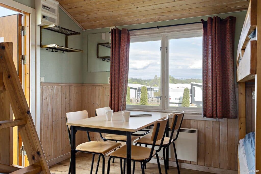 Frykenstuga Plus har et værelse på 12-15 kvm og er møbleret med to køjesenge, stole og et bord. Der er en kogeniche med køleskab, kogeplade, elkedel og enklere køkkenudstyr samt en dunk til at hente vand i. Der er dyner og puder til alle hyttens senge. Brusebad, toilet og køkken findes i det nærliggende servicehus.