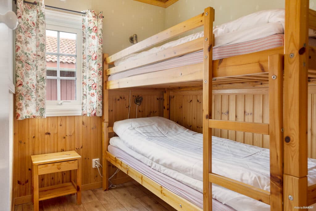 Sunnestugan er 40 kvm med to soveværelser og alrum/køkken. Der er en dobbeltseng i det ene soveværelse og en køjeseng i det andet samt en sovesove i alrummet. Der er dyner og puder til alle hyttens senge. I alrummet er der spiseplads og TV. I hytten er der et badeværelse med toilet og brusebad. Køkkenet er udstyret med opvaskemaskine, husgeråd, køleskab/fryser, komfur med ovn, kaffemaskine og mikroovn. Veranda med havemøbler.