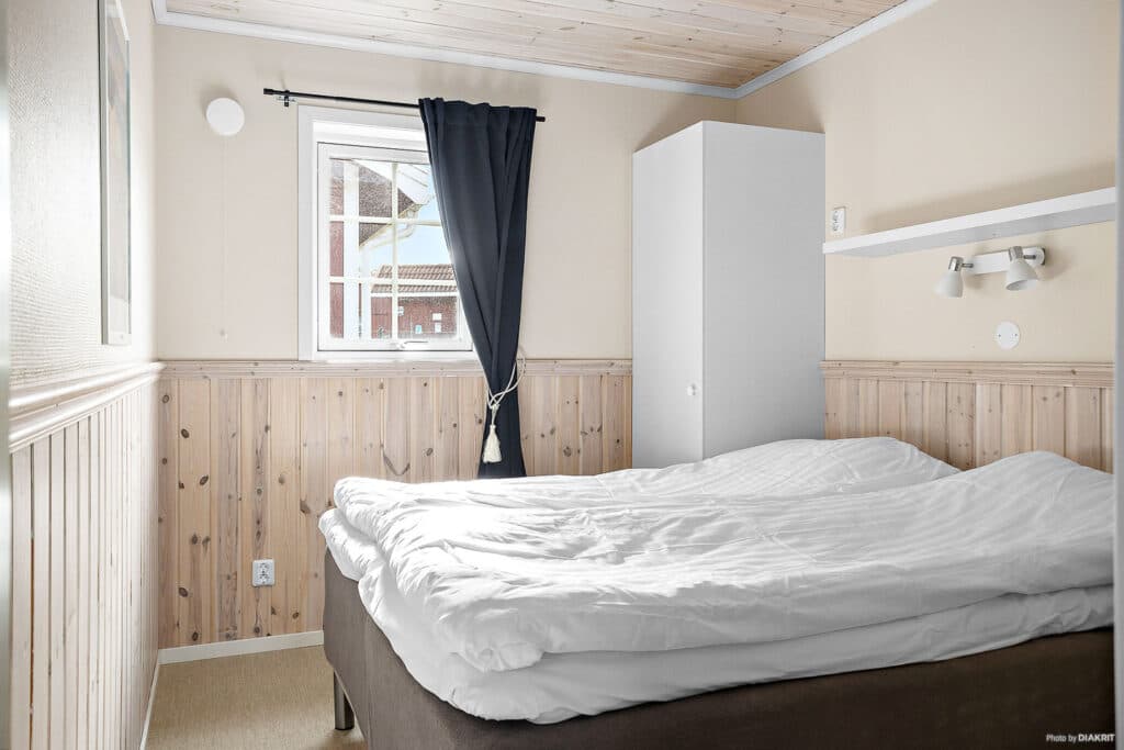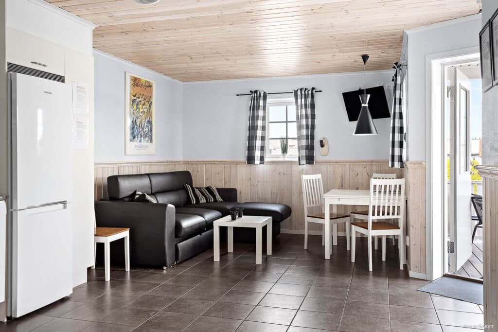 Sunnestuga Plus er 50 kvm med to soveværelser og alrum/køkken. En dobbeltseng i hvert soveværelse og en sovesofa i alrummet. Der er dyner og puder til alle hyttens senge. I alrummet er der spiseplads og TV. Toilet, brusebad og tørreskab findes i hyttens badeværelse. Køkkenet er udstyret med opvaskemaskine, husgeråd, køleskab/fryser, komfur med ovn, kaffemaskine og mikroovn. Veranda med havemøbler. Husdyr er ikke tiilladt.