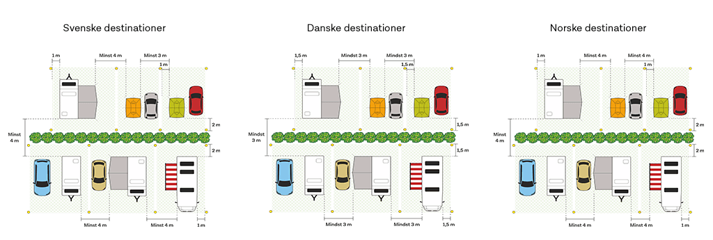 - Campingvogne skal opstilles på den lejede plads og i henhold til billedet nedenfor for at overholde de brandsikringsregler, vi er underlagt (medmindre andet er angivet på pladsen). Hvis du er i tvivl, så kontakt personalet, som er klar til at hjælpe dig.